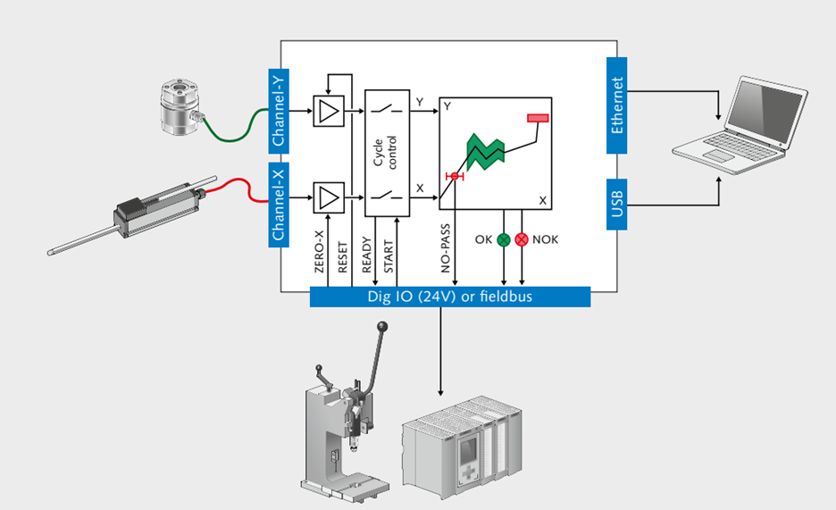 The 5867C is an enhanced version of Kistler’s proven maXYmos BL series. It evaluates force–displacement curves and provides OK/NOK results for each production cycle. The upgraded model features a 5-inch color touchscreen for intuitive operation, encoder signal support, and additional options for data transmission and remote monitoring—delivering greater flexibility and user convenience.
